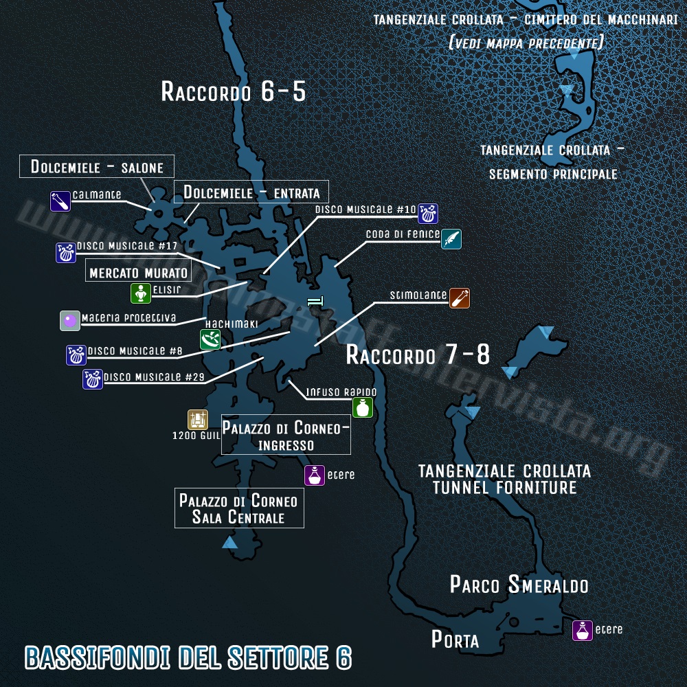 Ripreso il controllo di Cloud, seguite Aerith nel tunnel-scorciatoia, rompendo le casse di rifornimento Shinra sulla sinistra lungo il tragitto. Quando necessario, accovacciatevi sotto le lamiere per raggiungere la Tangenziale crollata dei Bassifondi del Settore 6. Prima di proseguire, assicuratevi che i vostri personaggi abbiano equipaggiate la Materia glaciale e la Materia aerea, così da poter sfruttare le debolezze elementali dei nemici in loco (Gelo e Vento). Assegnate anche una Materia galvanica, perché presto troveremo anche un nuovo tipo di nemico debole a Tuono.