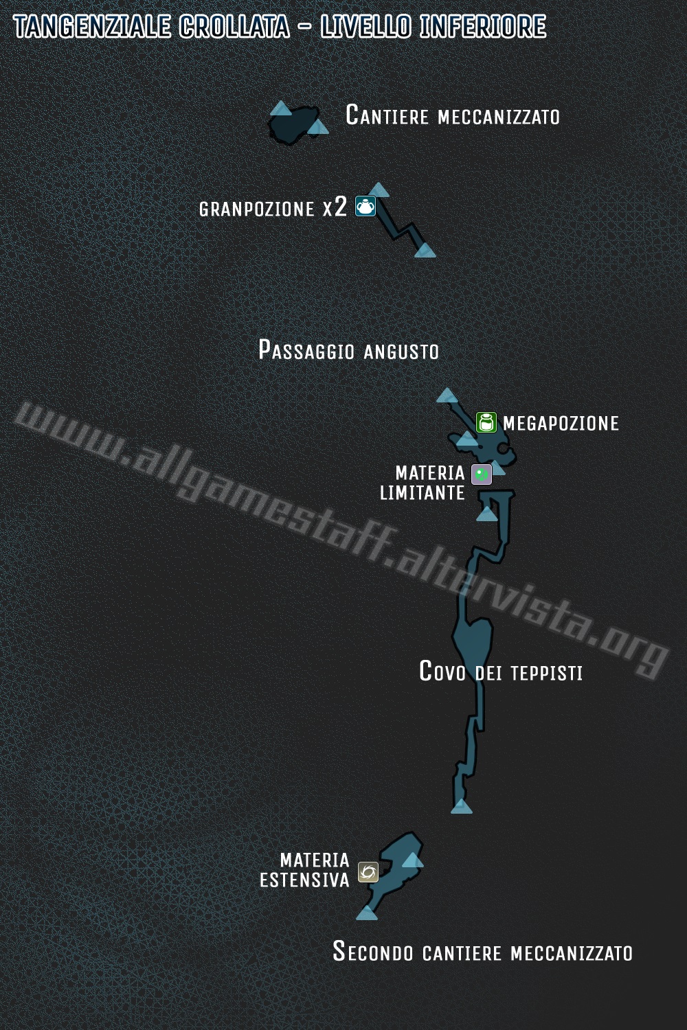 Salite la scaletta, distruggete le casse di rifornimenti Shinra subito sulla sinistra e preparatevi a conoscere un nuovo tipo di nemico: il Protoannientatore. Analizzatelo a dovere (non dimenticatelo) per scoprire che si tratta di una macchina debole al Tuono, quindi destabilizzatelo e strematelo con i vostri migliori attacchi di questo tipo (Fulgora in primis). Dopo averlo distrutto, interagite con Aerith nei pressi delle transenne: la ragazza commenterà che la via breve che voleva usare è stata chiusa. Parlatele ancora, se si va, poi dirigetevi verso la scaletta sulla destra del passaggio bloccato. Scendete fino in fondo, poi giratevi per trovare un forziere contenente 2 Granpozioni, quindi continuate lungo il corridoio e attraversate la fessura a sinistra, interagendo con l’icona