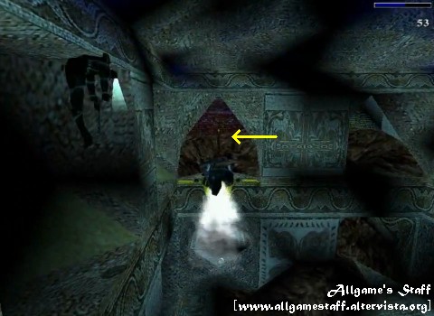 Segreto n°2: Quando arriverete vicino a una grata da cui proviene una debole luce rossa (figura), fate un salto all’indietro, premendo contemporaneamente il tasto Rotola. Così facendo, effettuerete un salto all’indietro con capriola, che vi permetterà di afferrare una grata dietro di voi. Non dimenticate di aggrapparvi, quindi salite per la nuova griglia, arrivando ad una nicchia. Sbloccherete il secondo segreto: il Razzo. In caso Lara non ne volesse sapere di issarsi nella stretta nicchia, lasciate un secondo la presa e riaggrappatevi all’istante, quindi tiratevi su. Ora scendete dalla nicchia e lasciatevi cadere sul piano di legno inclinato sottostante, eseguendo subito un salto all’indietro con capriola per riafferrare la griglia precedente.