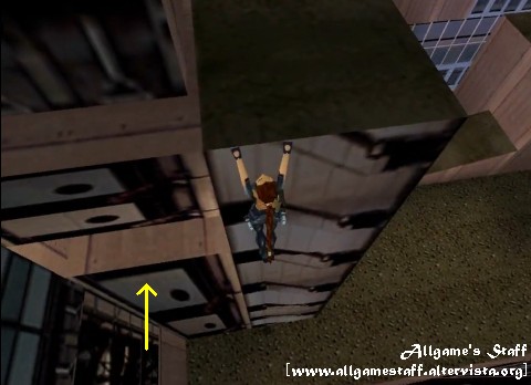 Segreto n°1: Aggrappatevi al bordo della piattaforma (figura) per scendere verso una nicchia sottostante e sbloccare il primo (e unico) segreto del livello: un Razzo e un Medikit grande. Lasciate la nicchia e cadete al suolo. Vi ritroverete al punto d’inizio. Ripetete il percorso precedente arrivando alla parete con la lampada rossa.